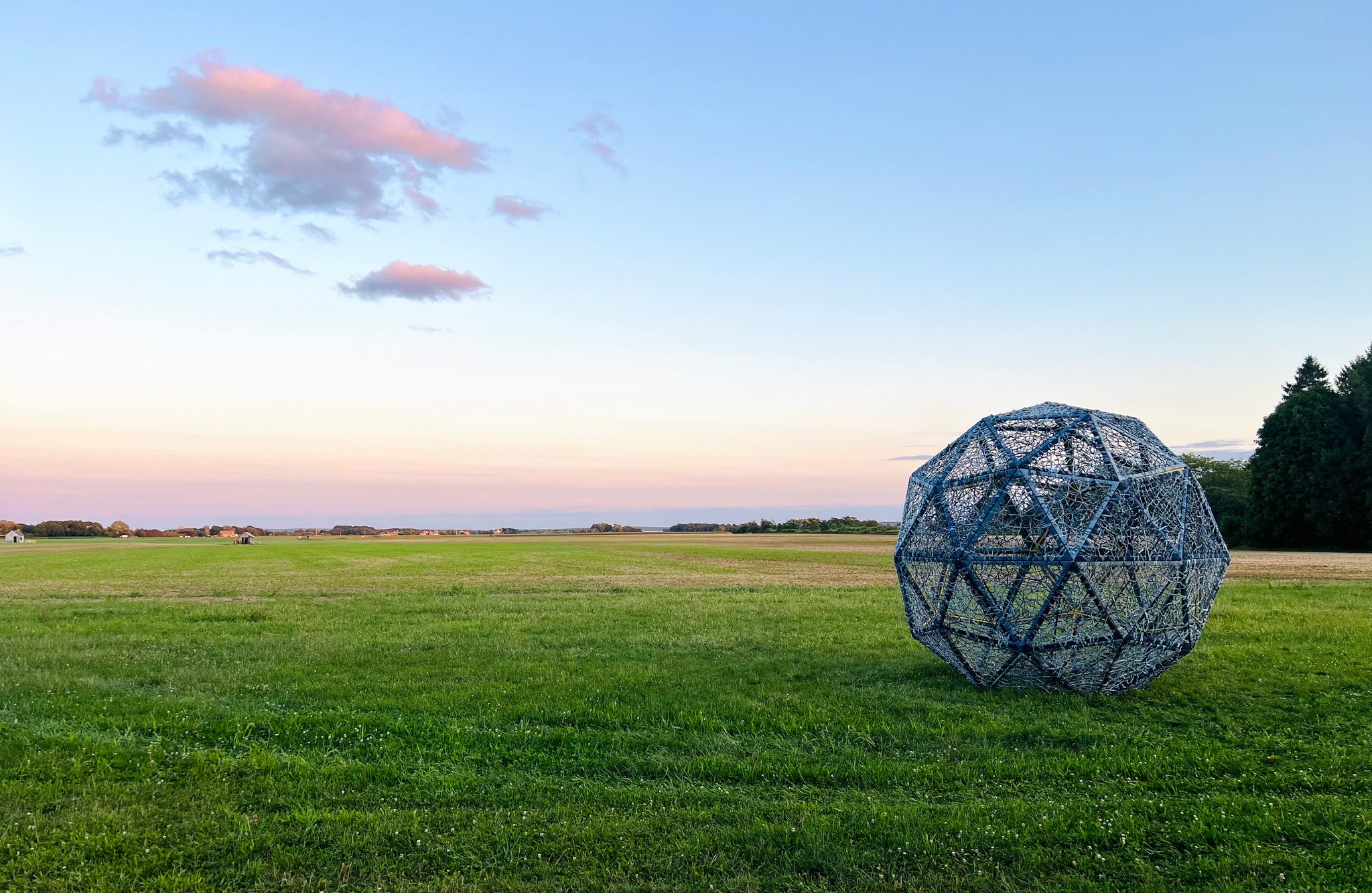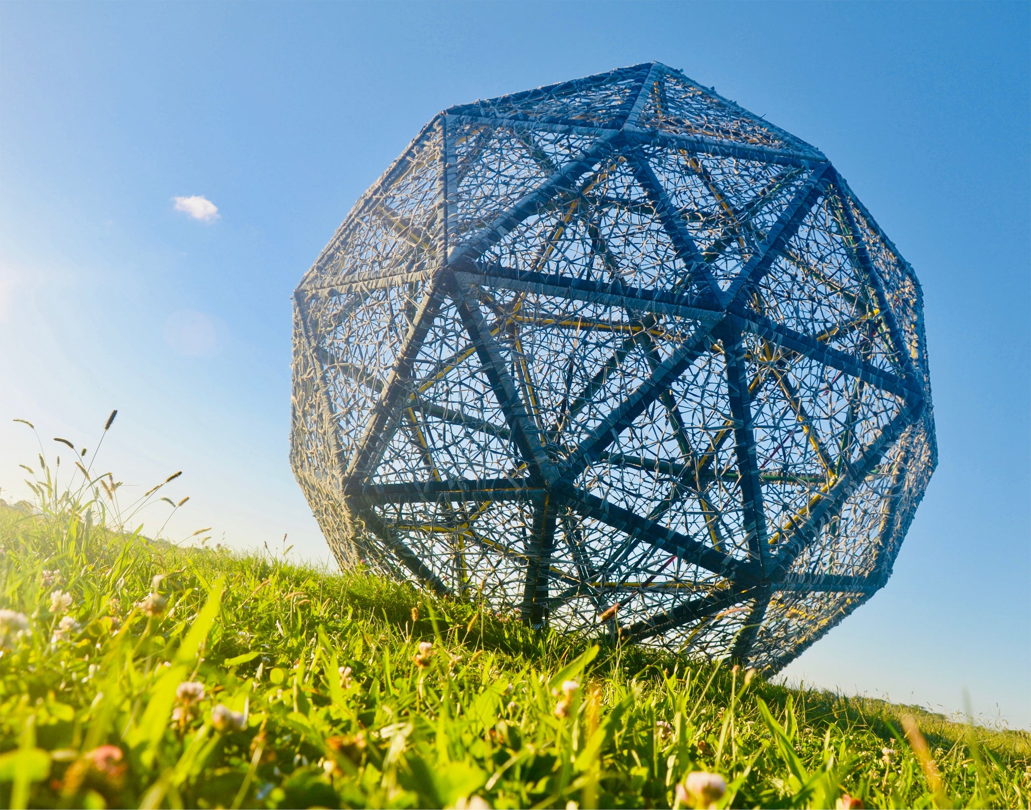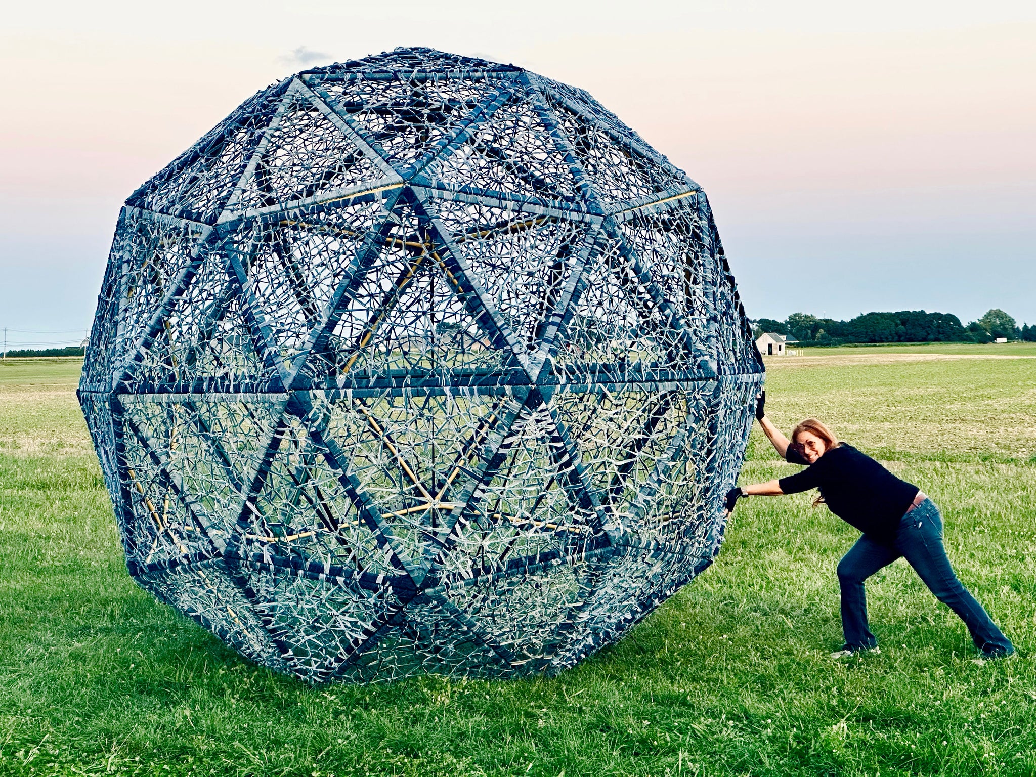 Harvesting Memories in Blue features a 12-foot high geodesic sphere situated on the DeLea Sod Farm along Sound Avenue in Riverhead, NY. This sculpture symbolically returns denim to its hardworking origins, intertwining artistic expression with the land itself. By merging visual narratives of labor with physical environments, this work pays homage to Sherry’s Midwest roots and embraces the East Coast agricultural community she now calls home. The work is dedicated to honoring the industrious people of the North Fork of Long Island and similar communities, celebrating their enduring spirit and contribution to humanity.