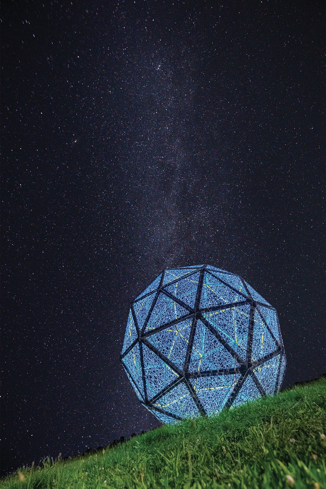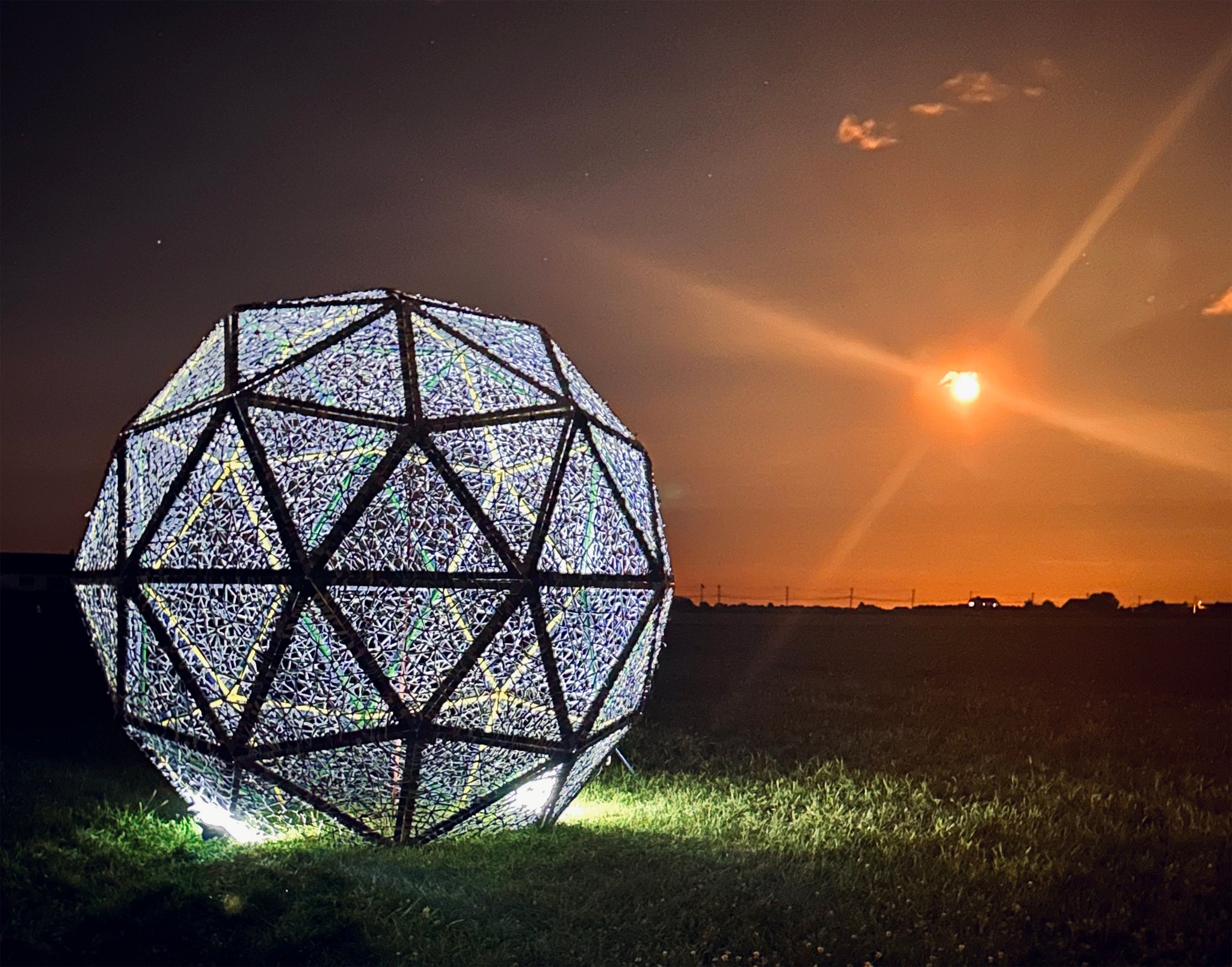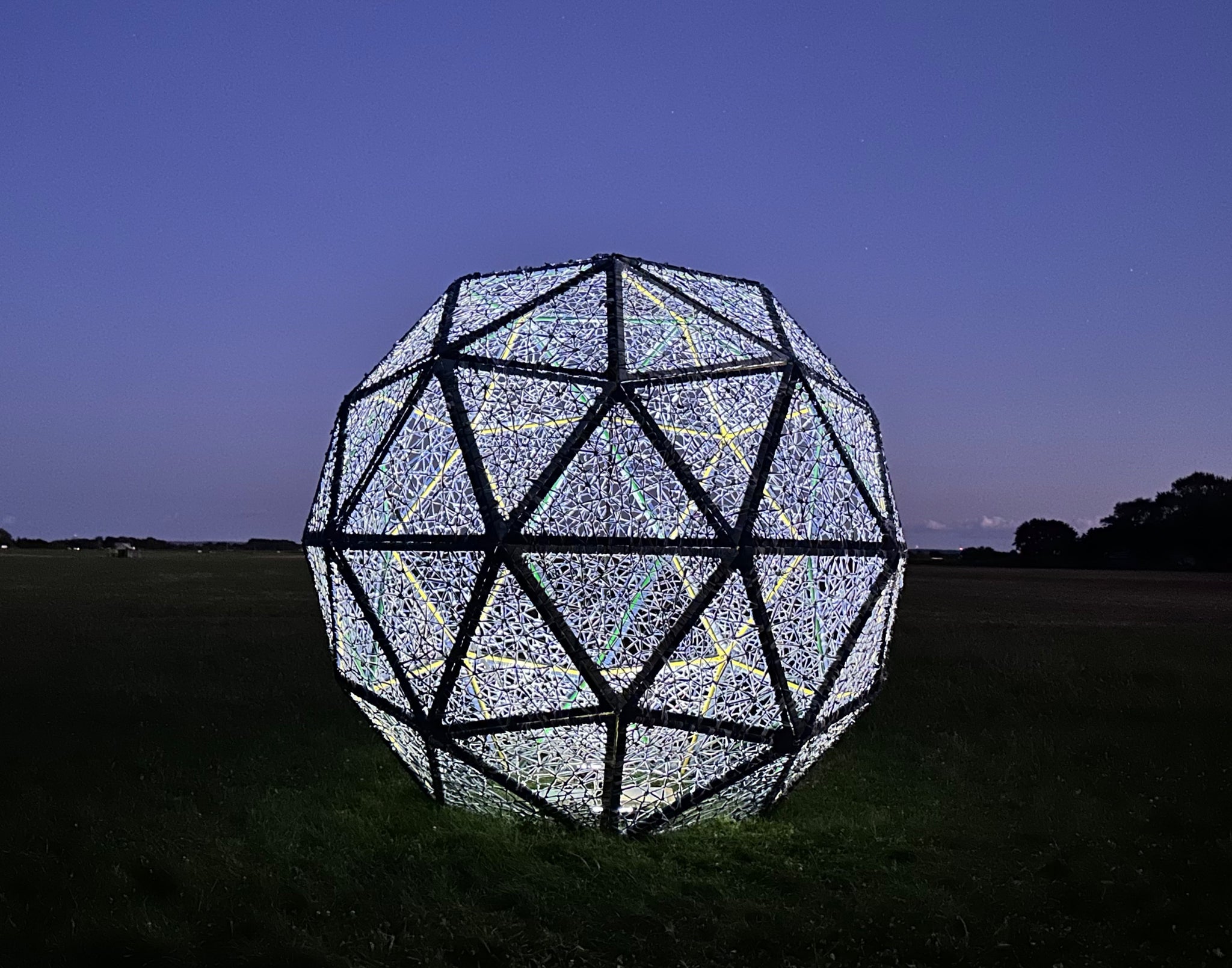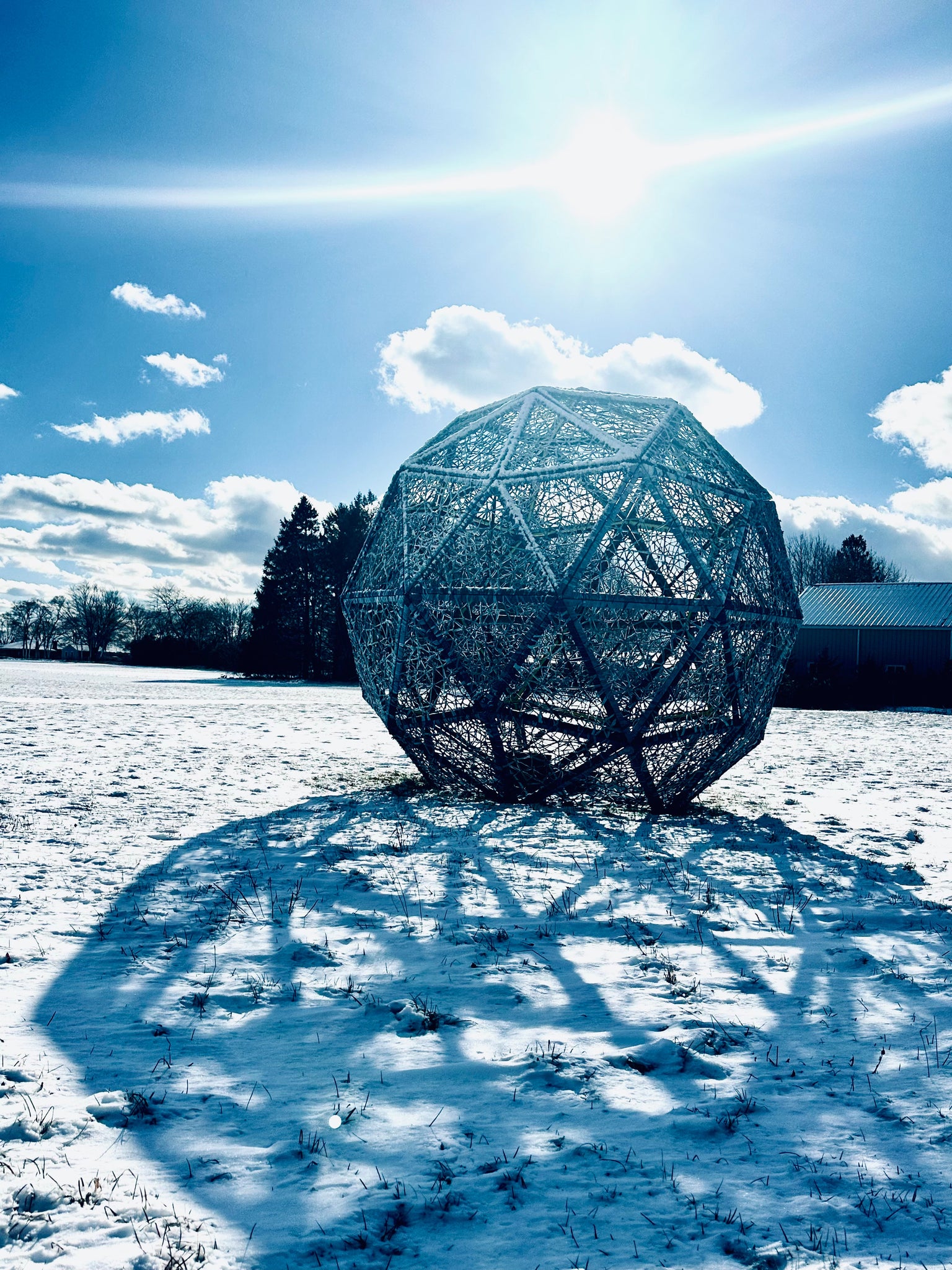 Harvesting Memories in Blue features a 12-foot high geodesic sphere situated on the DeLea Sod Farm along Sound Avenue in Riverhead, NY. This sculpture symbolically returns denim to its hardworking origins, intertwining artistic expression with the land itself. By merging visual narratives of labor with physical environments, this work pays homage to Sherry’s Midwest roots and embraces the East Coast agricultural community she now calls home. The work is dedicated to honoring the industrious people of the North Fork of Long Island and similar communities, celebrating their enduring spirit and contribution to humanity.